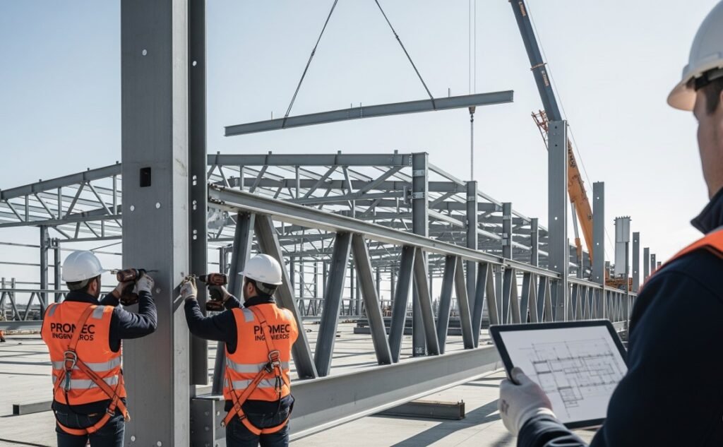 En PROMEC, somos especialistas en soluciones integrales para estructuras metálicas, abarcando el ciclo completo desde el diseño y la ingeniería de detalle hasta la fabricación y el montaje en sitio. Desarrollamos proyectos a medida como naves industriales, soportes para equipos, techos, plataformas y escaleras. Nuestro compromiso es entregar proyectos seguros, duraderos y de la más alta calidad, cumpliendo rigurosamente con los plazos y especificaciones técnicas para garantizar la máxima funcionalidad y resistencia en cada estructura que construimos.